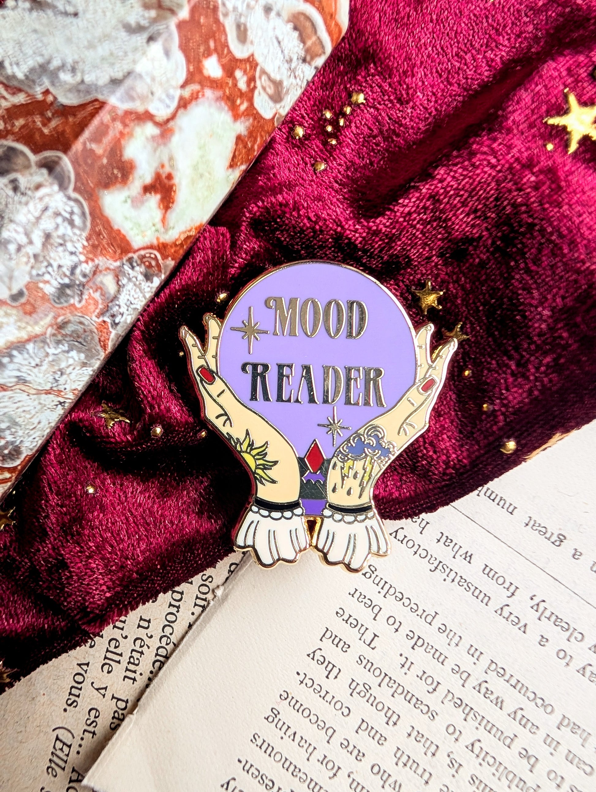 For those who let the universe (and their mood) decide what to read next! This enchanting enamel pin features a mystical crystal ball held by beautifully detailed hands with tattoos and painted nails, glowing in dreamy purple with the words “Mood Reader” shining at the centre.