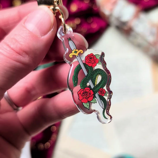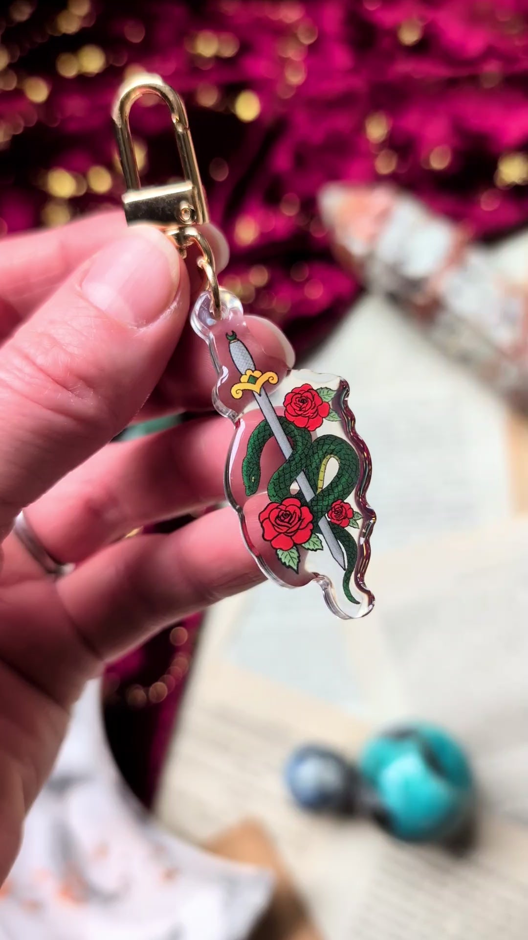Add a touch of dark fantasy flair to your keys, bags, or planner with this bold acrylic keyring! Featuring a green serpent wrapped around a silver sword, framed by blooming red roses, this fierce little charm is equal parts danger and beauty. It's the perfect accessory for your inner warrior, witch, or romantically dark soul.