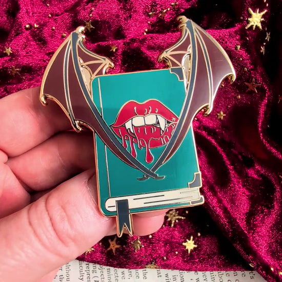 Bigger, bolder, and beautifully detailed, this pin is a must-have for dark fantasy readers, vampire romance fans, and Halloween fashionistas.