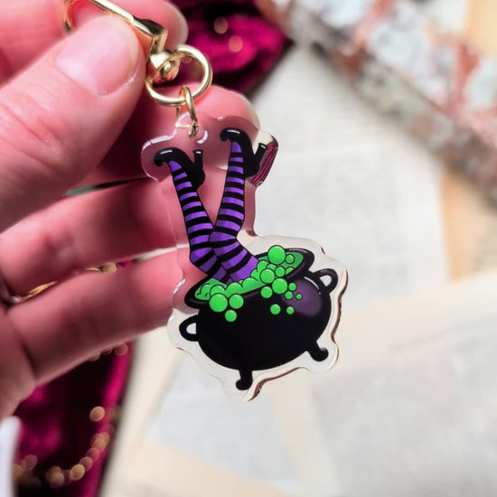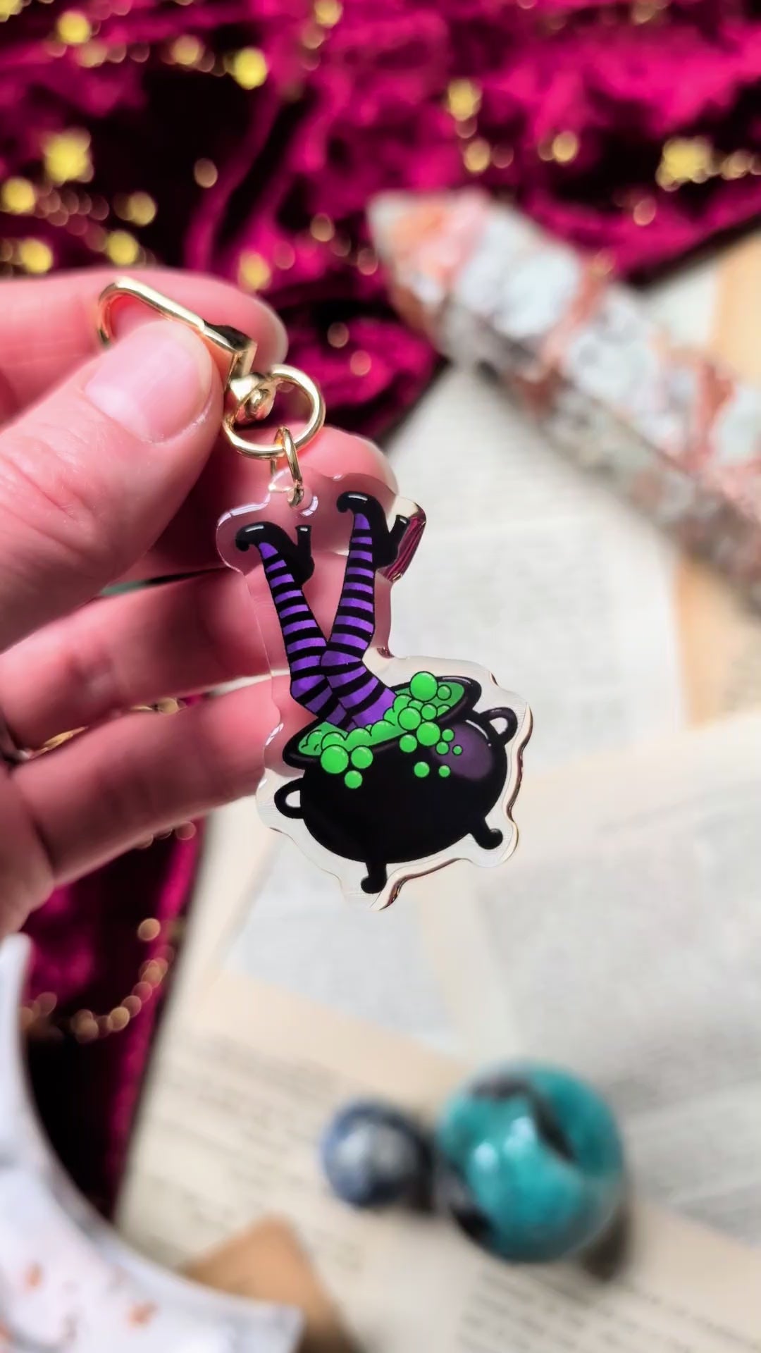 Double, double, toil and trouble… someone took a wrong step into the brew! This adorably chaotic acrylic keyring features a witch's legs kicking out of a bubbling cauldron—stripy stockings, classic boots, and all. It’s the perfect potion of spooky and silly for Halloween lovers, witches-at-heart, and magical mischief makers.